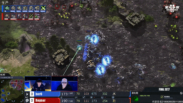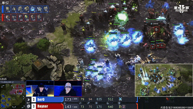 决胜局,8分钟herO的高阶圣堂武士与执政官主力遭Reynor的毒爆虫刺蛇全歼陷入绝境。